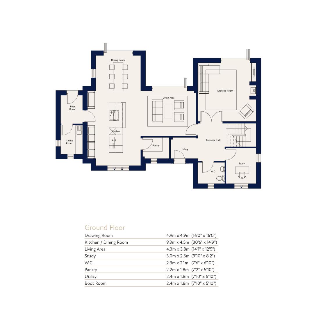 Cleverly designed by leading architects, the open-plan layout utilises shape to create a distinctive space for form and function. An L-shape kitchen, dining and living area coexist in a way for perfect harmony, leading to the patio area via bi-fold doors. A pantry is close by for extra storage and a boot room and utility leads to the garden, perfect for muddy walks along the stretch of Colne Water. Also looking out towards Ferndean View, the drawing room, complete with a gas burning stove, provides another area for relaxation. The downstairs bathroom is across the lobby, close to the study which overlooks the front of the house.