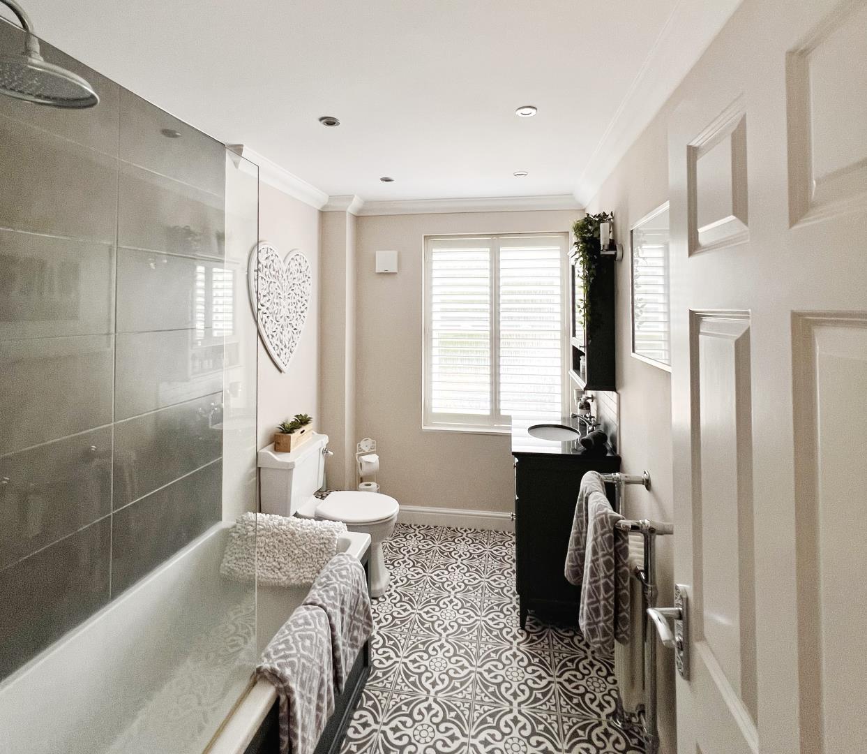 Bathtub. Extractor fan. Fitted with a three piece suite. Mirrored cabinet. Washbasin with mixer tap. Shower over the bath. Spacious. Rectangular room. Porcelain Tiles to floor. Coving to ceiling. Windows to rear. Sash window. Heated towel rail. Recessed spot lights.