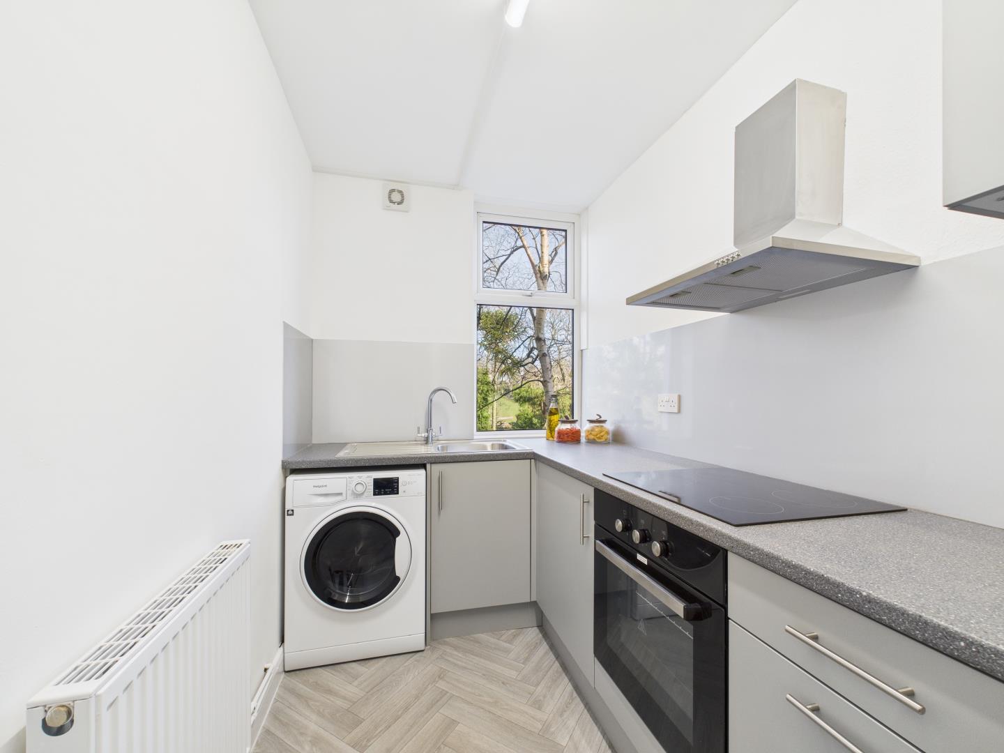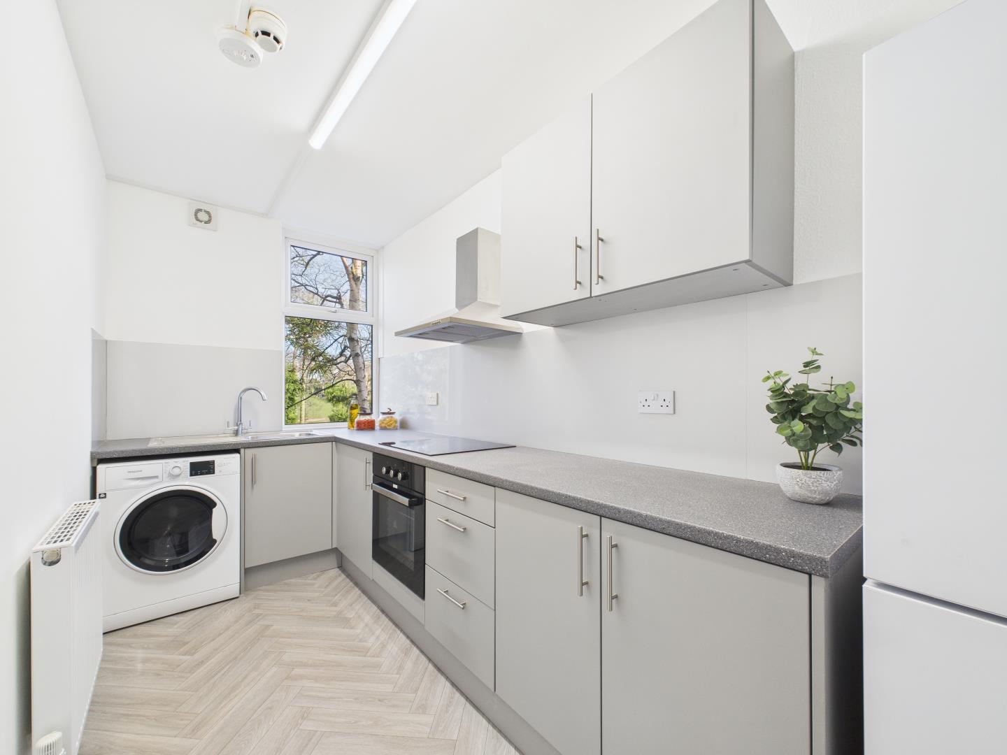 ✔ A sleek, newly installed kitchen with integrated appliances, including a fridge, oven, hob, and washer/dryer.